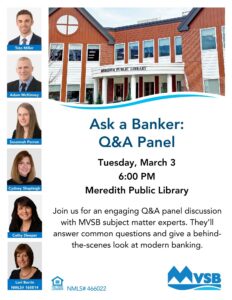 The Meredith Public Library will host an interactive Community Banking Q&A Panel with subject matter experts from MVSB and NHTrust at 6 pm Tuesday, March 3 at the Meredith Public Library.